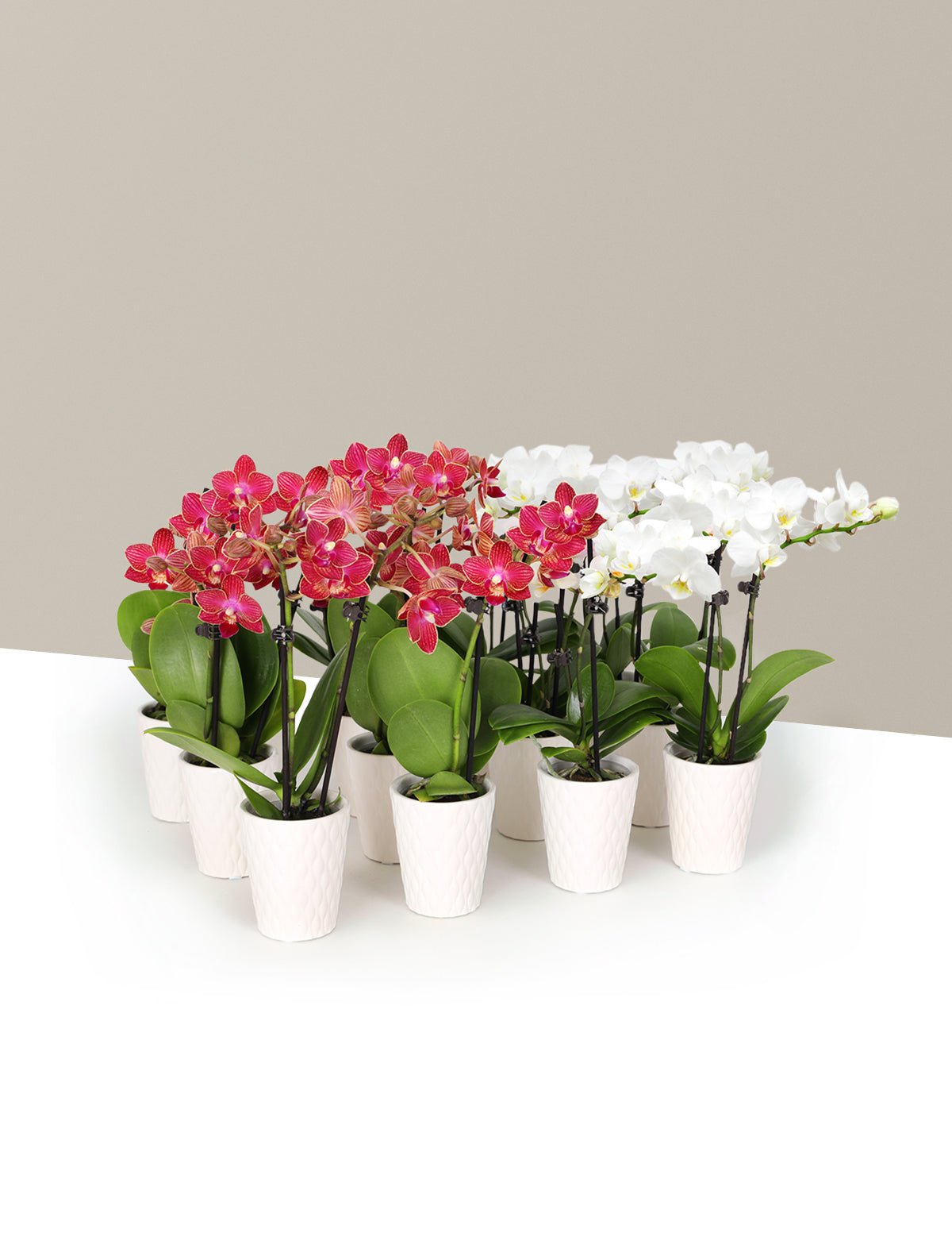 Save when you buy a plant party pack! Our Orchid Party Pack is an exclusive set of 12 assorted miniature Orchids offered in all white or red or you can split your assortment to include 6 assorted Echeveria succulents instead. This pack is perfect for holiday gifting and party favors! Each plant will arrive with matching white quilted planters to display them in.